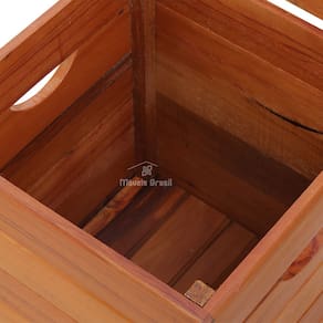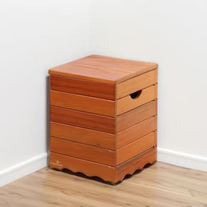 Banqueta Baú Ripada de Madeira Natural, funcional como assento e organizador, com espaço interno. Ideal para decoração rústica, varanda, sala ou quarto. Estrutura resistente, acabamento artesanal.