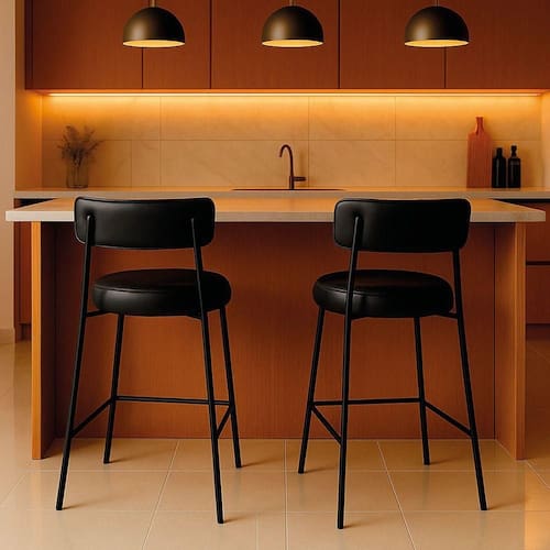Banqueta Cozinha Alta Com Encosto Industrial Preto Kit 2 Londres Pu D03 - D'rossi Cor Preto Renove sua cozinha, área gourmet ou ambiente comercial com o kit 2 Banquetas Alta Londres em sintético PU. Com 95 cm de altura total e 75 cm do assento ao chão, possui a proporção perfeita para bancadas e ilhas altas, garantindo conforto e ergonomia em cada uso. A estrutura em aço carbono na cor preta combinada à madeira de reflorestamento assegura resistência e durabilidade, enquanto o acabamento em pintura epóxi protege e realça o visual industrial da peça. O assento e o encosto fixos, estofados em espuma D-26 de alta densidade, proporcionam maciez e sustentação ideais. O revestimento agrega sofisticação e é fácil de limpar, mantendo o aspecto elegante por muito mais tempo. Seu design industrial apresenta base metálica vazada, que traz leveza visual e robustez estrutural, além de apoio para os pés integrado e capacidade para até 120 kg com total segurança. A Banqueta Londres é a escolha certa para quem busca elegância, praticidade e conforto em um só produto. Dimensões do Produto: