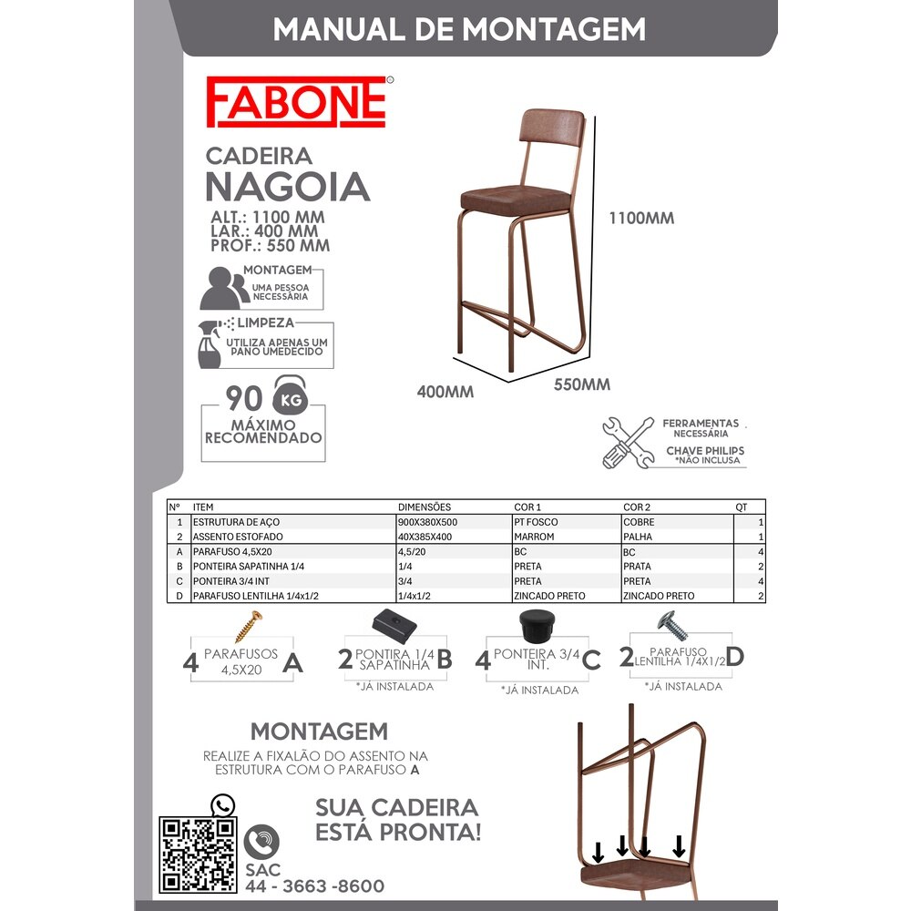 O assento é estofado com espuma D20, garantindo maciez e excelente apoio para o uso prolongado. Revestido em Corano sintético na cor marrom, o acabamento facilita a limpeza e confere um toque sofisticado ao ambiente. O encosto também conta com espuma para maior conforto ergonômico.