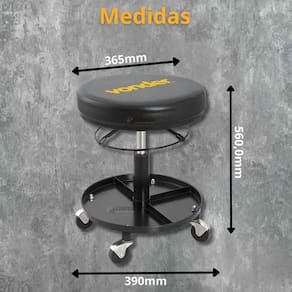 Detalhes técnicos: Material da banqueta para mecânico: estrutura em aço carbono e assento acolchoado; Cor da banqueta: preta; Altura máxima da banqueta: 560mm; Altura mínima da banqueta: 440mm; Capacidade máxima: 100kg; Medida do assento da banqueta: diâmetro: 365mm; Massa aproximada (peso): 6,44kg; Garantia: 90 dias.