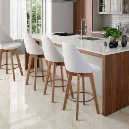 A Banqueta Maya Gourmet possui assento e pés em madeira eucalipto com sistema giratório. Os pés contam com um reforço extra que proporciona um suporte de peso de até 120 Kgs.O assento é revestido com espuma D-23 e revestido com tecido linho.