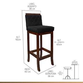 Apresentamos a banqueta Nice, feita com madeira maciça de reflorestamento e acabamento em verniz. Seu assento preenchido com espuma D26 e encosto com espuma D23 garantem conforto duradouro. O encanto adicional vem da costura matelassê no encosto, enquanto o revestimento em suede adiciona uma sensação de luxo. Adapta-se perfeitamente a qualquer espaço, adicionando elegância e conforto instantaneamente. CARACTERÍTICAS TÉCNICAS: - Produzido em Madeira Maciça de Reflorestamento; - Acabamento em Verniz na cor Castanho; - Assento Preenchido com Espuma D26; - Encosto Preenchido com Espuma D23; - Encosto com Costura Matelassê; - Revestimento em Suede na cor Preto. *Indicada para Bancadas/Mesas com Alt. 90/95 cm. *PRODUTO ENVIADO MONTADO. INFORMAÇÕES TÉCNICAS: Altura Total: 92 cm Altura até Assento: 65 cm Altura até Travessa: 13 cm Altura Encosto: 35 cm Largura Assento: 38 cm Largura Estrutura: 36 cm Profundidade Total: 42 cm Profundidade Assento: 41 cm Peso: 7 kg INFORMAÇÕES ADICIONAIS:ATENÇÃO: Móvel produzido em madeira maciça natural podendo ocorrer mudança no tom da madeira conforme o produto;*Conferir se o produto está de acordo com o que comprou, produto danificado não será aceito troca;**As imagens ambientadas são meramente ilustrativas e podem apresentar itens que não compõe o produto. As cores do produto podem variar de acordo com o monitor, a iluminação do ambiente ou sua percepção visual;***Limpeza deve ser feita com pano macio e seco ou levemente umedecido com água e sabão neutro. Não devem ser utilizados abrasivos como palha de aço e objetos cortantes;Garantia para defeitos de fabricação conforme Código de Defesa do Consumidor. Marca: CCS Interiores