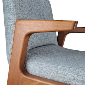 O assento e o encosto são generosamente acolchoados e estofados em linhão, texturizado em tons de cinza, proporcionando um toque suave e um visual neutro que se adapta a diversos estilos de decoração. O encosto é levemente inclinado para maior conforto, e a banqueta possui apoios de braço integrados à estrutura de madeira, um detalhe que adiciona um toque de requinte e funcionalidade.