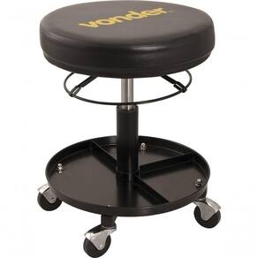 Possui bandeja porta-ferramentas, assento giratório acolchoado com alavanca para regulagem de altura, rodízios giratórios independentes e cilindro pneumático
