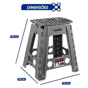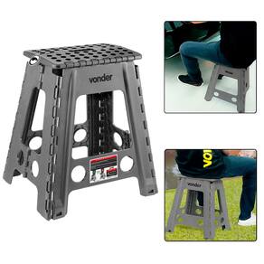 ESPECIFICAÇÃO TÉCNICA: - Material da banqueta: Polipropileno; - Capacidade de carga: 150 kgf; - Dimensões (fechada): Comprimento: 410 mm x Largura: 45 mm x Altura: 575 mm; - Dimensões (montada): Comprimento: 410 mm x Largura: 330 mm x Altura: 450 mm; - Cor da banqueta: Cinza; - Massa aproximada (peso): 1,83 kg.