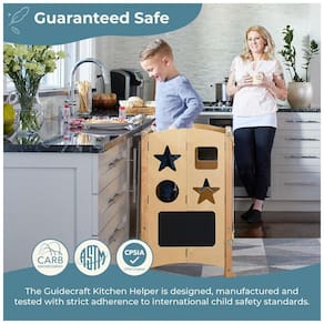 A banqueta torre de aprendizagem Guidecraft Classic Kitchen Helper é um banco auxiliar de bancada em madeira, dobrável e com altura ajustável, desenvolvido para crianças a partir de 18 meses. A estrutura compacta permite que a criança alcance a altura da bancada de cozinha com maior estabilidade, favorecendo a participação em atividades cotidianas sob supervisão de um adulto.