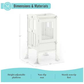 A banqueta torre de aprendizagem Martha Stewart Kitchen Helper Linen White é uma estrutura infantil em madeira, dobrável e com altura ajustável, desenvolvida para que crianças a partir de 18 meses alcancem a altura da bancada com mais segurança. O design em branco linho com laterais recortadas e janelas integra-se a cozinhas residenciais, permitindo que a criança participe de atividades de preparo de alimentos e outras tarefas sob supervisão de um adulto.?