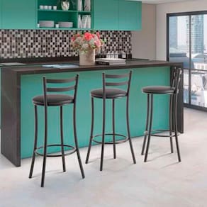 Características: Referência de modelo: 17 Estrutura: Tubo de aço 1 nas pernas dianteira e traseira; tubo de aço 5/8 na amarra circular inferior e assento; chapa de aço de 1,9 mm de espessura no encosto; Revestimento: Pintura epóxi Assento: Aglomerado de 15 mm Revestimento do assento:Tecido tipo napa com manta, estofado com espuma D16 Altura do assento ao chão: 68 cm Diâmetro do assento:35,00 cm