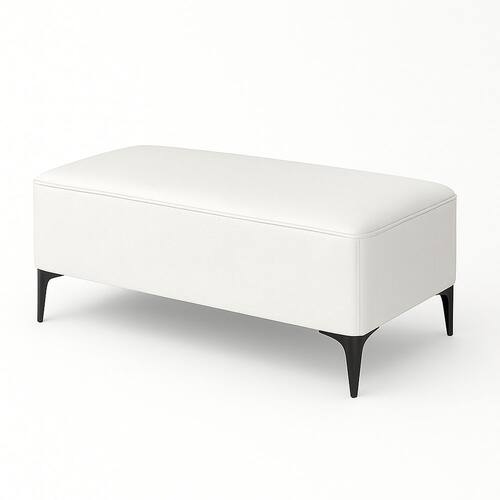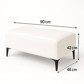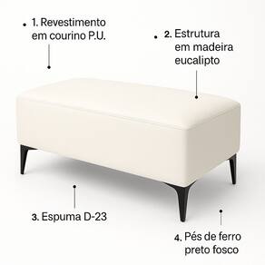Minimalismo com estilo. O Puff Vegas em courino branco oferece requinte e leveza, ideal para ambientes claros e luxuosos. Estrutura de madeira tratada, pés de ferro e espumas de alta qualidade completam o visual clean com conforto e resistência.
