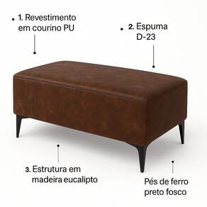 O Puff Vegas em courino marrom pinhão escuro transforma qualquer ambiente com seu visual marcante. Estrutura em madeira de eucalipto, pés de ferro e acabamento premium garantem durabilidade. Espumas D23 e D26 oferecem o conforto ideal para relaxar ou decorar com estilo.