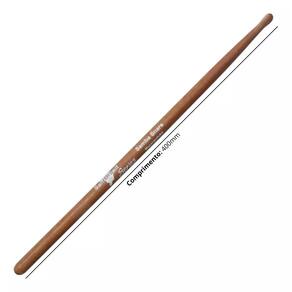 No que diz respeito às dimensões, a baqueta possui aproximadamente 40,7 centímetros de comprimento e cerca de 15 milímetros de diâmetro. Essas medidas foram pensadas para oferecer ao percussionista uma pegada firme, segura e confortável. O comprimento permite um bom alcance e controle, enquanto o diâmetro proporciona estabilidade e potência na execução. O peso, proporcional à densidade da madeira, ajuda no controle da articulação e na geração de volume, sendo ideal para quem precisa de projeção sonora e impacto rítmico.
