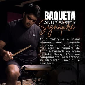 Anup sastry e a meinl desenvolveram uma baqueta signature que é grande, mas ágil. O modelo de anup tem como base a nossa heavy 2b, com comprimento aumentado, afilamento médio e peso leve. Essa combinação oferece grande alcance e potência, mantendo um toque leve e responsivo - sem parecer pesada ou lenta. Uma camada extra de verniz fino foi aplicada para melhorar a aderência. como uma baqueta maior, ela é muito bem equilibrada. Nem muito pesada, nem muito leve. Sempre quis uma baqueta um pouco mais longa e grossa que uma 2b padrão, mas que não fosse pesada ou cansativa. Ela une o melhor dos dois mundos: as dimensões de uma baqueta grande com o peso de algo mais leve e ágil.