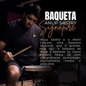 Anup sastry e a meinl desenvolveram uma baqueta signature que é grande, mas ágil. O modelo de anup tem como base a nossa heavy 2b, com comprimento aumentado, afilamento médio e peso leve. Essa combinação oferece grande alcance e potência, mantendo um toque leve e responsivo - sem parecer pesada ou lenta. Uma camada extra de verniz fino foi aplicada para melhorar a aderência. como uma baqueta maior, ela é muito bem equilibrada. Nem muito pesada, nem muito leve. Sempre quis uma baqueta um pouco mais longa e grossa que uma 2b padrão, mas que não fosse pesada ou cansativa. Ela une o melhor dos dois mundos: as dimensões de uma baqueta grande com o peso de algo mais leve e ágil.