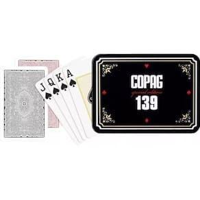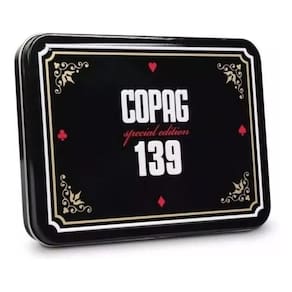 O Baralho mais vendido no Brasil em uma edição especial para os amantes dos jogos de carteado. São dois decks do famoso Baralho 139 Copag dentro de uma linda lata. Produto fabricado com excelência de qualidade. Não transparente, atóxico e reciclável. Cartão Couché exclusivo com deslize aveludado de agradável manuseio. Tipo da carta: Cartão couché 290g Tamanho da carta: Bridge Size 57x89 mm Tamanho naipe: Convencional Quantidade de cartas: 110 cartas (2 jogos de 52 cartas + 2 curingas + 2 cartas garantia)