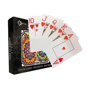 Você que adora aquele jogo de baralho temos o baralho perfeito para todo os tipos de modalidade, Desde aquele jogador mais casual até os competidores mais exigentes.Com um visual bonito e sofisticado, o baralho tem um material incrível, garante alta resistência, um deslize ideal e um toque suave.Ótima opção para presentear aquele bom amigo e familiares, e até se presentear também.CARACTERÍSTICASMaterial PlásticoNaipes GrandesTamanho 58mm x 58mmBaralho Duplo com 54 Cartas CadaEstojo Duplo em PlásticoCONTEÚDO ENVIADO1 Baralho Duplo com 54 Cartas Cada1 Estojo Duplo em Plástico