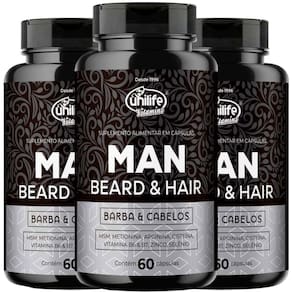 Man Beard & Hair 60 Cápsulas da Unilife, possui uma formulação exclusiva de 60 cápsulas de 600 mg projetada para aprimorar a saúde e a vitalidade dos cabelos e da barba.