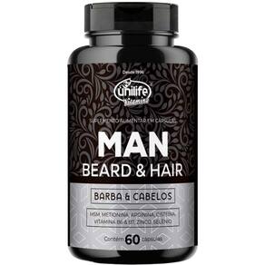 Man Beard & Hair 60 Cápsulas da Unilife, possui uma formulação exclusiva de 60 cápsulas de 600 mg projetada para aprimorar a saúde e a vitalidade dos cabelos e da barba.