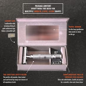 Seu melhor conjunto de barbear. 1. O lendário barbeador de segurança Chieftain 2. Uma capa de luxo com espelho. 3. Um conjunto de lâminas de treino revestidas de platina para você começar com segurança 4. Um folheto de instruções fácil de seguir para iniciantes ansiosos. 5. Suporte ilimitado - O barbear mais suave para homens e mulheres – reduz significativamente os pelos encravados, irritações na pele e queimaduras de navalha frequentemente experimentadas com lâminas de barbear de cartucho de plástico, ajudando você a finalmente obter o barbear mais suave, limpo e próximo. - Durabilidade vitalícia – Este clássico barbeador de segurança de borda dupla é feito de metais sólidos e premium, assim dura facilmente uma vida inteira. - Escolha sábia e econômica: as lâminas de substituição são mais suaves, mais eficazes e significativamente mais baratas (15x-20x) do que cartuchos de plástico. - Reutilizável e reciclável: ao contrário dos caros cartuchos de barbear descartáveis, quando você compra este produto, todo o barbeador e todas as suas lâminas de recarga contêm zero plástico, portanto, 100% reutilizável e reciclável. - Conteúdo da embalagem: 1 navalha de segurança (lâmina única), 5 lâminas de aço sueco revestidas de platina, 1 caixa de luxo. Este é o presente ideal para aniversários, Natal, Dia dos Namorados, Dia dos Pais ou das Mães. - Pequenas empresas – Este produto é de uma pequena marca de empresa familiar. Suporte pequeno.