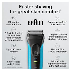 Máquina de barbear Braun Electric Series 3 com aparador de precisão, barbeador recarregável, úmido e seco para homens, azul/preto, 4 peças — BARBEAR FECHADO E LIMPO: o sistema flutuante sem 3 lâminas segue os contornos faciais para um acabamento perfeito e inclui um aparador médio para cortar pêlos difíceis junto com 2 elementos de barbear SensoFoil para maior proximidade e conforto da pele - CAPTURA MAIS CABELO: aparador de precisão para maior precisão aparador de bigode e costeletas, inclui um MicroComb especializado projetado para capturar mais cabelo em cada traçado*em comparação com a série 3 da Braun, testada em 3 dias barbas - Feito para durar: barbeador elétrico sem fio durável, com duração de até 7 anos e projetado para depilação com água, espuma ou gel - Alimentado por bateria sem fio: bateria ni-mh recarregável que oferece 45 minutos de barbear (até uma semana de barbear). 5 minutos de carga rápida são suficientes para um barbear - O QUE VEM NA CAIXA: barbeador elétrico Braun Série 3, tampa protetora, plugue inteligente para ajuste automático de voltagem de 100-240 — O MELHOR PRESENTE: Ótimos presentes de Natal, aniversário e aniversário para ele. Presente perfeito para marido, namorado, pai e todos os homens da sua vida, não apenas para o Dia dos Pais!