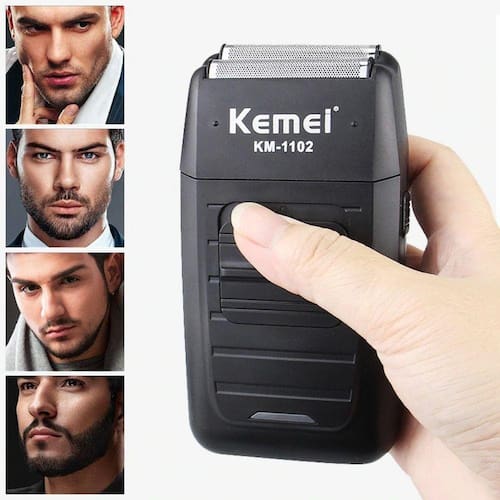 Kemei KM-1102 é um barbeador elétrico de barbear, podendo substituir a navalha. Onde pode usar: Aparar a barba Pressiona ON/OFF para ligar a máquina de barbear Aparar as costeletas Empurre para trás o botão para ligar e puxe o aparador Tensão: 110-220 Potência: 3 w Pacote inclui: 1-barbeador 1-capa protetora 1-plug adaptador 1-escova de limpeza 1-manual