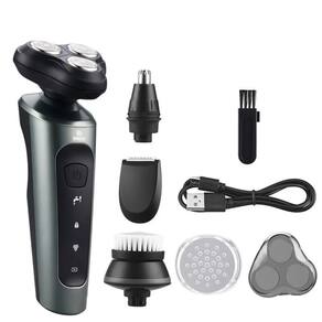 Barbeador elétrico 4 em 1 com aparador de barba, costeletas e nariz. Corpo lavável (IPX7). Possui 4 indicadores (lavagem, trava de segurança, cabeça do barbeador, bateria). Cabeça rotativa que se ajusta às curvas do rosto e pescoço.Características