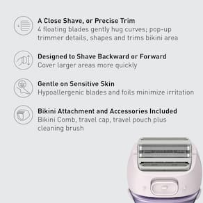 Barbeador elétrico Panasonic para mulheres, barbeador sem fio de 4 lâminas, acessório de biquíni, aparador pop-up, operação a seco e úmido - ES-AWL8AV (roxo) - Um barbeador elétrico seguro e suave para mulheres: experimente um barbear fácil, curvo e suave em um design reutilizável e recarregável que minimiza a irritação da pele e reduz o desperdício de barbeador descartável - Um barbear rápido e apertado: barbeie de forma rápida e suave com 4 lâminas flutuantes ultrafinas e duas películas externas ultrafinas; use um movimento fácil de ir e vir para cobrir rapidamente áreas maiores do corpo — barbear delicado e detalhado, e também para aparar: lâminas hipoalergênicas de aço inoxidável ajudam a evitar irritações e inchaços na pele sensível; o aparador dobrável e o pente de biquíni incluído garantem uma limpeza próxima e segura de áreas sensíveis - Impermeável para uso úmido ou seco: barbeie-se dentro ou fora do chuveiro com um design confortável de barbear que é fácil de manusear, mesmo com as mãos molhadas - Todos os acessórios de higiene e viagem de que você precisa: touca e bolsa de viagem incluídos facilita o barbear em qualquer lugar; o suporte de carregamento sem fio oferece até 35 minutos de uso com uma única carga