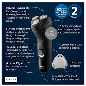O barbeador Philips 3000X oferece um barbear rápido e confortável. As 27 lâminas autoafiáveis para uso seco ou molhado e o aparador retrátil tornam o barbeador fácil de usar e proporcionam um excelente resultado. Possui 2 anos de garantia e 90 dias para testar. Lâminas ComfortCut As 27 lâminas autoafiáveis cortam confortavelmente os pelos bem rente à pele, proporcionando acabamento suave e uniforme, sempre. As lâminas autoafiáveis permanecem novas por 2 anos. Sistema de corte anticorrosão As lâminas do barbeador são feitas de aço cirúrgico hipoalergênico para resistir à corrosão, evitar impurezas e proteger sua pele. 40 minutos de uso sem fio (1 hora de carregamento) Em apenas uma hora, a bateria durável NiMH fica totalmente carregada para você se barbear por 13 vezes. Está com pressa? Uma carga rápida de 5 minutos fornece energia suficiente para você se barbear uma vez. Barbear a seco e com a pele molhada Escolha entre um prático barbear a seco ou um refrescante barbear úmido com gel ou espuma, até mesmo debaixo do chuveiro. Aparador retrátil Refine e defina o bigode e as costeletas com o aparador retrátil e complete seu visual com facilidade. Formato que cabe na mão Nunca perca a sua pega. O cabo ergonômico em borracha proporciona conforto e segurança, mesmo quando molhado. Cabeças flutuantes 3D As cabeças flutuantes movem-se livremente em três direções para manter o contato com as curvas do rosto, sem cortar a pele. Abertura com um único toque Para abrir a cabeça do barbeador e lavá-la em água corrente, basta tocar em um botão. Indicador de carga da bateria Não seja pego de surpresa por uma bateria vazia. O indicador da bateria permite que você saiba se a bateria está fraca, vazia ou sendo carregada Carregamento USB-A Na Philips, impulsionamos a sustentabilidade em todos os aspectos da criação de produtos. Nossa ambição é diminuir o desperdício e reduzir o número de adaptadores USB que colocamos no mercado." Características Uso: Uso Molhado Tipo: Barbeadores Velocidades: 01 Quantidade de Lâmina/Pente: Tampa de proteção Aparador retrátil incluídoLâminas Hipoalergênicas Remove os Pelos pela Raiz Portátil Lavável Indicador de Carga Sistema Giratório Recarregável Uso/Operação: sem Fio Especificações Técnicas Modelo: X3021/00 Voltagem: Bivolt Cor: Preto EAN: 8720689024693 Garantia: 24 meses Dimensões e Peso Dimensões do produto sem embalagem (AxLxP): 190x100x80 mm Dimensões do produto com embalagem (AxLxP): 205x169x209 mm Peso do produto sem embalagem: 0,32 Kg Peso do produto com embalagem: 0,42 Kg Itens Inclusos 01 Barbeador 01 Tampa de proteção Aparador retrátil incluído