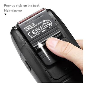 Atrás dele possui um trimmer que serve para aparar costeletas e a barba, acompanha também uma bolsinha para levar em suas viagens ou guardar o produto.