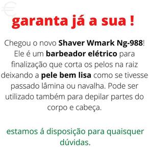 Chegou o novo Shaver Wmark Ng-988 Ele é um barbeador elétrico para finalização que corta os pelos na raiz deixando a pele bem lisa como se tivesse passado Gillet ou navalha. Pode ser utilizado também para depilar partes do corpo e cabeça.Modelo: NG-988 VerdeDuas cabeças reciprocas e flutuantes.Speed velocidade do motor: 7000 rpm.Housing alojamento transparente completo.Interface tipo-c interface de carregamento.- Bateria de lítio: 2x600mah,1.5 horas de carga completa para 120 minutos de uso.Display com led exibição de energia da bateria restante.Cover capa destacável com grade, conveniênciaPara limpar e substituir a cabeça da gillet.Barbeador, maquininha de barbear, barbeador eletrico, kemei, aparelho de barbear eletrico, maquina shaver, barbeador titanium, maquina de barba, barbeador elétrico, shaver, Barbeador vintage t9, barbeador kemei, bladerpro barbeador, shaver kemei, mini barbeador eletrico, aparelho barbear eletrico, maquina de fazer barba, barbiasdor eletrico, Barbeador fusion pro, barbeador titanio, wmark ng-988, shaver wmark ng-988Especificações Técnicas:Itens Inclusos:1- Maquina NG9881- Cabo USB Type-C para o carregamento1- Escova de limpeza.1- 1 Saquinho de veludo para guardarRegistro Inmetro Ocp 0151