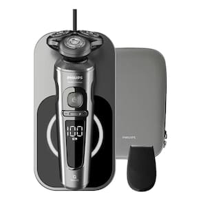 Contém: Clique no aparador de precisão Manual do proprietário Barbeador elétrico Philips Norelco S9000 Prestige Qi-Charge Cabo de alimentação Estojo de armazenamento premium Qi Charger