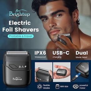 Lista de produtos: mini barbeador elétrico portátil Brightup para viagem; mini escova de limpeza; manual do usuário; cabo de carregamento USB-C; bolsa de armazenamento. - Design inovador de lâminas duplas: diferenciado dos barbeadores comuns de cabeça dupla, nosso barbeador portátil de viagem é configurado com uma lâmina de cabelo longo + design de lâmina de alumínio dentro das restrições de aparência compacta, que pode lidar facilmente com o comprimento da barba por barba que não foi raspada por 2 a 3 dias e reduz a sensação de tração que ocorre durante o barbear. - Exterior extremamente compacto: 8 x 6 x 2,5 cm, você pode até carregar este mini barbeador no bolso da calça. Não ocupa muito espaço, muito adequado para homens de negócios em viagens de negócios ou como um companheiro de limpeza de barba em movimento. Oferece a você uma maravilhosa experiência de barbear em todos os momentos e em qualquer lugar. - Tamanho pequeno, grande potência: este barbeador elétrico de viagem para homens possui uma bateria de lítio de 700 mAh de alta qualidade, vem com cabo de carregamento USB-C (plugue de carregamento não incluído), totalmente carregado, pode funcionar continuamente por 90 minutos. Desfrute de um desempenho potente, suave e duradouro a cada barbear. - Vá de barba para mais perto: se você não depilar em 2 ou mais dias, ao barbear, coloque a lâmina de corte de cabelo comprido com pente à sua frente para aparar a barba primeiro. seguido pela lâmina de alumínio para um barbear rente. Se você tiver uma barba longa, levará mais tempo para se acostumar com a ideia de apará-la em uma barba curta e deixá-la por uma semana antes de limpá-la. - Barbeador impermeável, fácil de limpar: nosso barbeador facial masculino é à prova d'água de corpo inteiro, você pode desfrutar de um barbear seco confortável ou um barbear úmido refrescante com espuma de barbear. O design da cabeça destacável permite que você remova a cabeça do cortador diretamente após o barbear e limpe-a com água corrente, proporcionando uma experiência de barbear mais limpa. - Presentes ideais para homens: Nosso barbeador elétrico vem com cabo USB C, escova de limpeza e bolsa de armazenamento, adequado para viagens/negócios. Maravilhoso para dar a maridos, pais, filhos e namorados em qualquer dia especial.