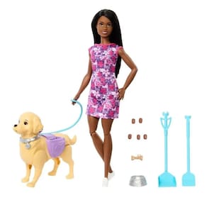 A missão da Mattel é empoderar a nova geração para explorar a maravilha que é ser criança! A boneca Barbie Brooklyn passeia com seu cachorro pela Cidade Grande e você pode ajudar a deixar tudo limpinho pelo caminho! Girar o mecanismo do cachorro de brinquedo e puxar a coleira faz com que você possa vê-lo realmente andar. Ao empurrar a cauda, o cachorro faz cocô e, em seguida, você pode recolher com a pazinha. Com acessórios como uma coleira que cabe nas mãos da boneca, uma tigela de comida e um petisco para cães! A boneca não pode ficar em pé sozinha.