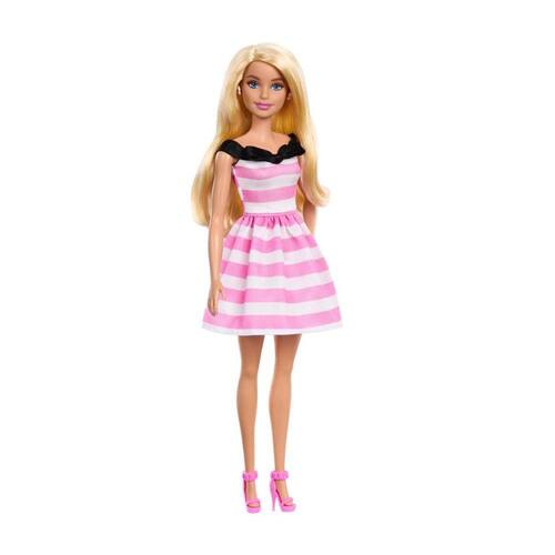 Comemore o 65º aniversário da Barbie com esta boneca Barbie comemorativa Ela arrasa com um vestido listrado rosa e branco acentuado por um detalhe de laço preto no decote. Brincos perolados e saltos rosa completam seu visual clássico Esta boneca é um lindo presente para crianças e fãs da Barbie de qualquer idade.