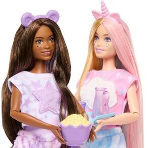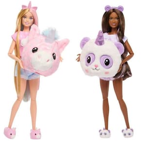 A Cozy Cute Tees Slumber Party apresenta duas bonecas Barbie ´Malibu´ e Barbie ´Brooklyn´ Cutie Reveal, dois animais de estimação e muita diversão na festa do pijama. Revele os bonecos removendo as cabeças de unicórnio e panda de pelúcia e descubra seu visual completo sob os sacos de dormir.