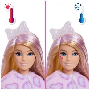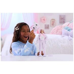 A Barbie Cutie Reveal Cuddly Series estilo Kitten traz uma personagem Barbie dentro de um macacão de pelúcia de gatinho roxo pastel, com experiência de unboxing focada em texturas macias, transformação e mini pet. O traje tem laços decorativos e aparência de bichinho de pelúcia, pensado para crianças que gostam de animais fofos e fantasia.