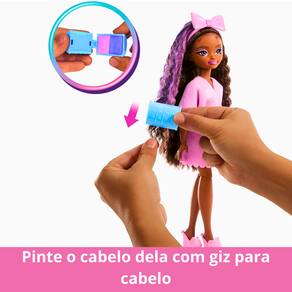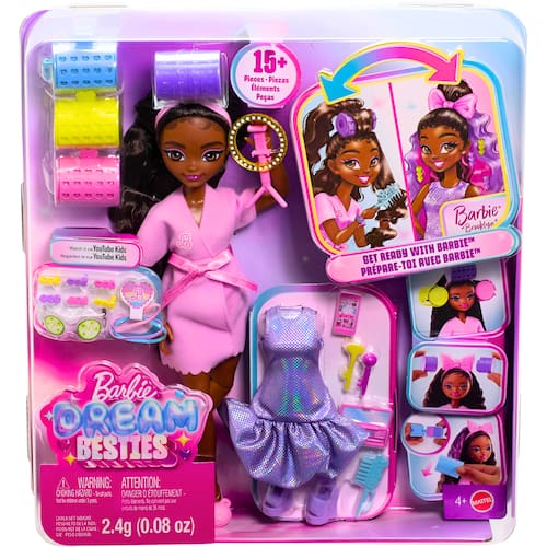 Descrição do produto : " A boneca Barbie ""Brooklyn"" Dream Besties da GET READY WITH BARBIE incentiva as crianças a expressarem seus sentimentos por meio da moda e da maquiagem! Abra os bobes para encontrar diferentes acessórios para o cabelo, como giz de cabelo e um laço grande para um estilo divertido! A boneca fashion articulada inclui roupas removíveis, como seu robe de preparação, máscara de pepino para os olhos, vestido brilhante e saltos altos. A Barbie tem cabelos longos para um estilo divertido. Arrume o cabelo dela com elásticos e presilhas, e até adicione giz de cabelo! O cabelo e a maquiagem da Barbie estão prontos! Ajude-a a colocar seu vestido brilhante e a finalizar seu look com diferentes acessórios, como seu celular, anel de luz e joias. A Barbie pode retocar seu look final com sua paleta de maquiagem e pincéis! O conjunto de bonecas é para crianças a partir de 4 anos, especialmente aquelas que adoram se arrumar com moda, maquiagem e penteados! : " Detalhes técnicos : Marca: Mattel : Referência: JGG39 : Idade recomendada: 3 : Material: Plastico : Ean: 194735313297 : Peso (kg): 0,53 : Dimensões aproximadas da embalagem: 33 x 30 x 6 cm :