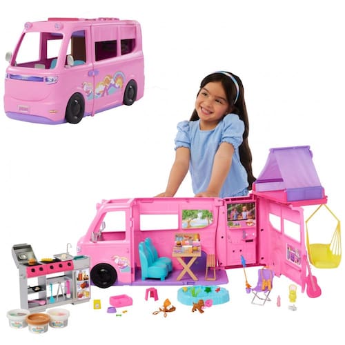 O Barbie Dream Camper 2025 é um playset de veículo-casa sobre rodas projetado para brincadeiras de acampamento, com estrutura que se abre e revela múltiplas áreas internas e externas de brincar. O conjunto oferece sete zonas de atividade (sala de estar, área de refeições, banheiro, área externa com lago para pesca, balanço, estação de churrasco e barraca retrátil no teto), voltadas a narrativas de viagem e vida ao ar livre com bonecas Barbie vendidas separadamente.
