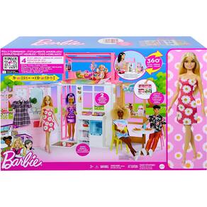 A imaginação é convidada a entrar nessa casa da Barbie, com a brincadeira acontecendo por todos os lados, dois andares, quatro áreas para brincar e diversas peças para criar mais narrativas! Essa casa da Barbie totalmente mobiliada conta com um design moderno com o estilo próprio da Barbie e tudo o que as crianças precisam para criar histórias, incluindo uma Barbie e seu adorável filhotinho! Receba seus amigos na porta da frente, prepare algo divertido na cozinha e sirva na mesa de jantar com lugar para dois. Após um dia cheio de brincadeiras, as crianças podem colocar a Barbie na cama do loft para ela ter uma boa noite de sono. Móveis e acessórios divertidos inspiram narrativas sem fim, e quando a brincadeira terminar, todo o conjunto se dobra para facilitar a limpeza ou a brincadeira em qualquer lugar. Com tantas oportunidades de narrativas, esta casa da Barbie é um excelente presente para crianças de 3 a 7 anos. As cores e as decorações podem variar.
