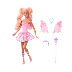 Agite a varinha em seu corpete para revelar um efeito ombre encantador. Com um vestido brilhante, salto alto, faixa de borboleta e colar de gota d'água, a Barbie Fada Cores Mágicas brilha em todos os detalhes. Deixe um rastro de brilho por onde passar e explore um mundo de imaginação e fantasia com esta boneca encantadora.