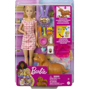 Surpresa: a adorável cachorrinha de estimação da Barbie® está esperando filhotes! Com o conjunto Barbie® cachorrinhos recém-nascidos, as crianças podem ajudar a boneca Barbie® a fazer o parto de três adoráveis filhotes de cachorro quando pressionam as costas da mamãe. Depois de dar as boas-vindas aos filhotes, as crianças podem encher a banheira com água gelada, depois mergulhar a toalha e passar sobre os cachorrinhos para revelar uma marca especial de nascimento em cada um. Os joelhos flexíveis da boneca Barbie ajudam-no a acolher os seus novos pets e, com um suporte para cachorros adorável com espaço para os três cachorrinhos, ela pode cuidar deles em movimento! Os acessórios adicionais para contar narrativas incluem uma garrafa, duas escovas, um brinquedo de corda, duas comidinhas, um saco de ração para cães e uma tigela. Com tantos acessórios para alimentar e oportunidades de narrativas, o conjunto de Cachorrinhos recém-nascidos da Barbie® é um excelente presente para crianças de 3 a 7 anos, especialmente para aquelas que adoram bichinhos! A boneca não fica em pé sozinha. As cores e as decorações podem variar.