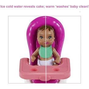 Inclui: Boneca babá Skipper, boneca pequena que muda de cor, cadeirão de alimentação, presente com trem de brinquedo, balão em forma de coração, copo de bebida, chapéu de aniversário
