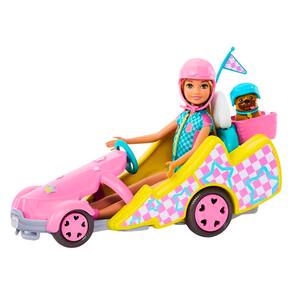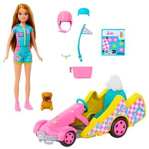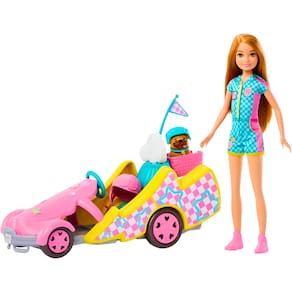 A boneca Stacie e seu kart acompanham você na pista! Com rodas que rolam, decoração quadriculada, uma bandeira removível e uma cesta de cachorro acoplável, esse veículo parece ter saído direto do filme de animação Barbie e Stacie ao Resgate. Há também uma folha de adesivos para que as crianças possam personalizar seu kart. A boneca Stacie veste sua roupa de corrida e está pronta para acelerar. A boneca não pode ficar em pé sozinha. As cores e as decorações podem variar.