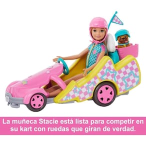 A boneca Stacie e seu kart acompanham você na pista Com rodas que rolam, decoração quadriculada, uma bandeira removível e uma cesta de cachorro acoplável, esse veículo parece ter saído direto do filme de animação Barbie e Stacie ao Resgate. Há também uma folha de adesivos para que as crianças possam personalizar seu kart. A boneca Stacie veste sua roupa de corrida e está pronta para acelerar. A boneca não pode ficar em pé sozinha. As cores e as decorações podem variar.