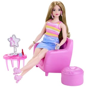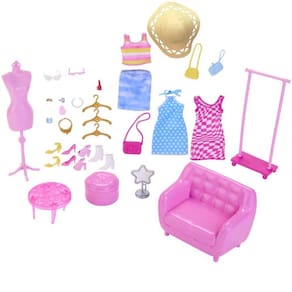 Conteudo - 01 Barbie® com 3 modelitos completos; - 01 sofá; - 01 mesa; - 01 pufe; - 01 arara; - 01 manequim; - 01 espelho; - 03 cabides; - acessórios de estilo variados; - A boneca não fica em pé sozinha. - As cores e as decorações podem variar.