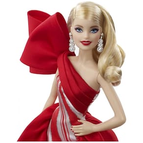 A Barbie Holiday 2019 loira foi concebida como peça colecionável de fim de ano, com foco em um visual festivo que combina estampa natalina em vermelho e branco com detalhes prateados. O vestido longo apresenta estampa temática em toda a saia, brilho em áreas selecionadas e laço volumoso em um dos ombros, acompanhado de uma cauda em tecido acetinado vermelho que confere maior presença visual à peça.