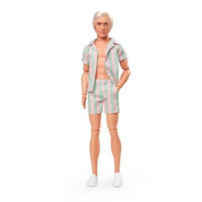 Inspirado no personagem Ken em Barbie O Filme, este boneco Ken usa um conjunto praiano listrado combinando. Com uma prancha de surfe a tiracolo, ele está tendo o melhor dia de todos na Barbie Land! Fãs e colecionadores vão adorar ter este item em sua coleção, celebrando o universo de Barbie.