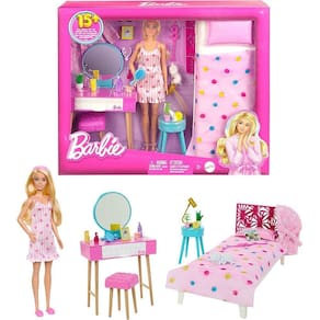 A Barbie está muito confortável neste conjunto de quarto Com cama, mesinha de cabeceira, penteadeira e muitos acessórios temáticos, as crianças podem brincar com a rotina da manhã e da hora de dormir ou inventar suas próprias histórias criativas. Detalhes, como um gatinho sonolento e um roupão macio, adicionam ainda mais charme ao conjunto. A boneca não fica em pé sozinha.A Barbie vem com um gatinho sonolento e 20 peças coloridas com tema de quarto.CaracterísticasMarca: MattelRef: HPT55Idade: 3+ anosMaterial: PlásticoAltura da boneca: aproximadamente 27cmImagens Meramente IlustrativasHomologação Inmetro: IP-BRI-0200/2022-02