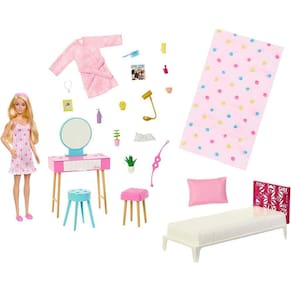 A Barbie está muito confortável neste conjunto de quarto Com cama, mesinha de cabeceira, penteadeira e muitos acessórios temáticos, as crianças podem brincar com a rotina da manhã e da hora de dormir ou inventar suas próprias histórias criativas. Detalhes, como um gatinho sonolento e um roupão macio, adicionam ainda mais charme ao conjunto. A boneca não fica em pé sozinha.