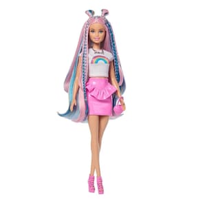 A boneca Barbie Rainbow Sparkle Hair vem com acessórios estilosos para criar diversos penteados, incluindo presilhas, elásticos, tiara, chapinha, secador, escova, spray, colar e bolsa.