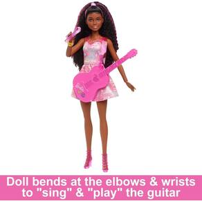 Boneca Barbie Pop Star com vestido deslumbrante e violão, pronta para brilhar s palcos e conquistar o público Articulações múltiplas s ombros, cotovelos, pulsos, quadril e joelhos para poses incríveis durante as apresentações Ideal para crianças a partir de 3 as, estimula a criatividade e o desenvolvimento do talento musica